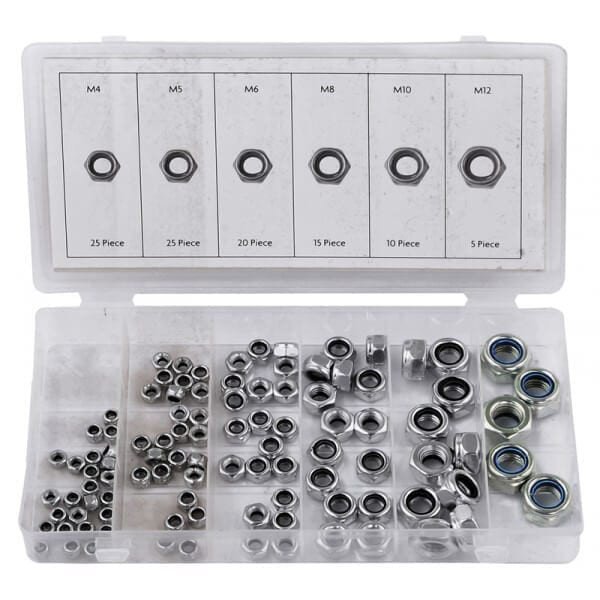100pc Locknut Assortment Ideal for high vibration applications, nylon insert eliminates the need for lock washers. Contains 25pc M4, 25pc M5, 20pc M6, 15pc M8 10pc M10, 5pc M12