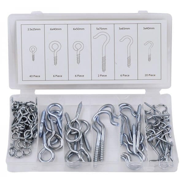 80pc Hook & Eye Bolt Assortment Galvanized steel construction. Contains Eye bolts 40pc 2.5 x 25mm, 6pc 6 x 40mm, 6pc 6 x 50mm. Hook bolts 2pc 5 x 75mm, 6pc 5 x 65mm, 20pc 3 x 40mm